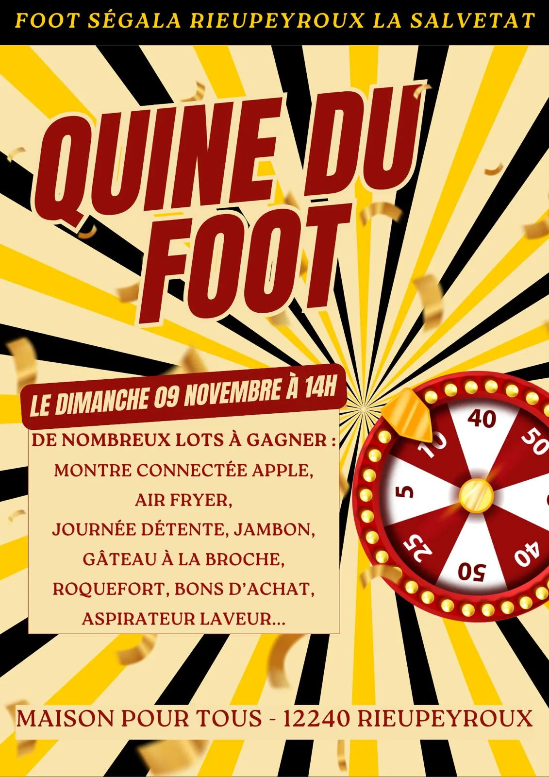 Rejoignez-nous pour un après-midi convivial autour de notre Quine du Club FSRS ! Venez tenter votre chance et gagner de nombreux lots tout en soutenant notre association : montre connectée, air fryer, journée détente, jambon, bons d’achat, …